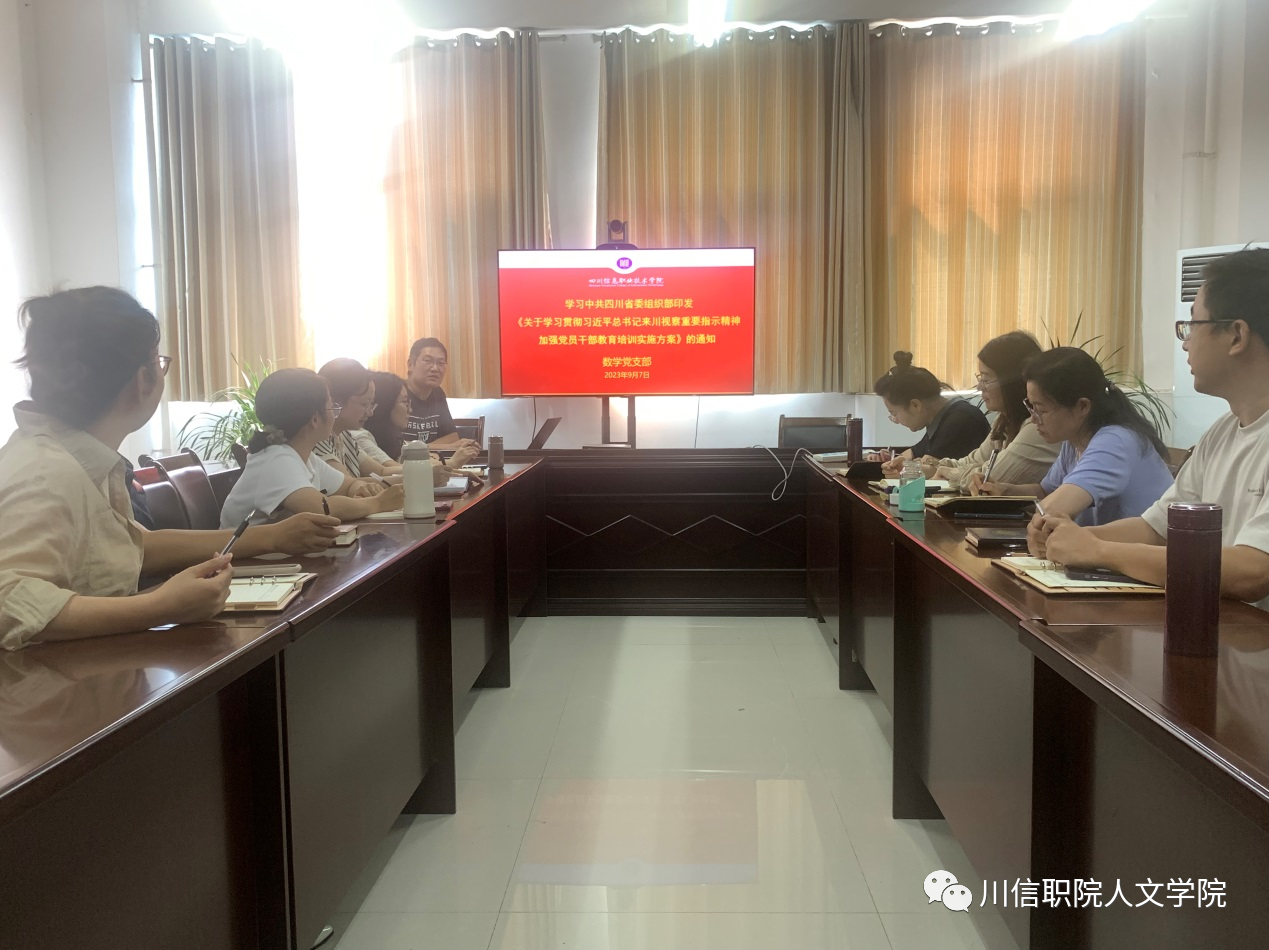 9月7日,数学党支部在0801召开党员大会,集中学习中共四川省委组织部印发《关于学习贯彻习近平总书记来川视察重要指示精神加强党员干部教育培训实施方案》的通知以及中共四川省直机关工委关于印发《关于进一步加强省直部门(单位)所属事业单位党的建设工作的指导意见(试行)》等3个文件的通知。
